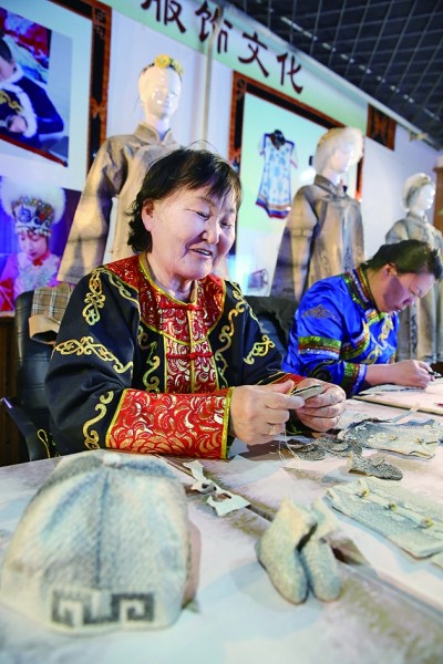 国家级非遗赫哲族鱼皮制作技艺代表性传承人尤文凤(左)在用鱼皮制作民族服饰。本报记者 闫汇芳摄